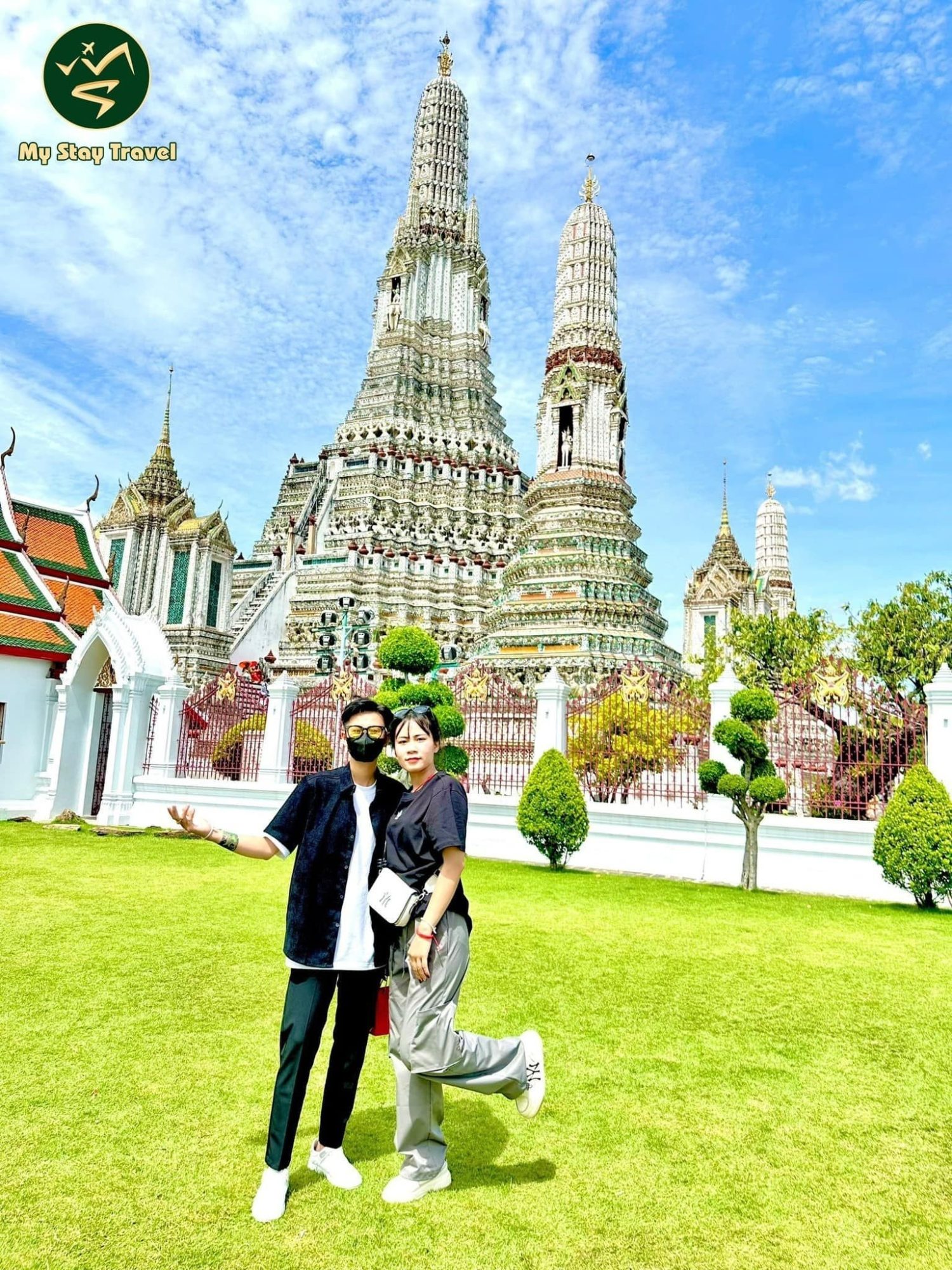 Đoàn tiếp tục tham quan chùa Wat Arun – là một trong những ngôi chùa cổ kính nhất của Bangkok (Thái Lan), có tên tiếng Việt là Bình Minh. Ngôi chùa hùng vĩ cao hơn 70m. Xung quanh các ngọn tháp, những mảnh kính hoặc gốm sứ nhỏ được trang trí, tạo màu sắc lộng lẫy, bắt mắt, làm nên nét đẹp riêng biệt cho điểm đến này.